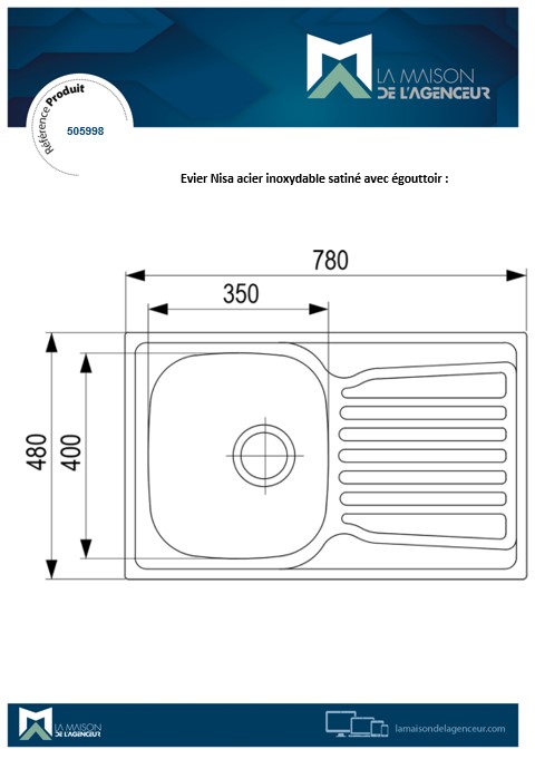 Évier Nisa,acier inoxydable satiné 780x480. Évier avec trop-plein et surface d'égouttement. Un siphon extra-plat fait partie du package. L'évier est fourni sans ouverture. • Dimensions : 780 × 480 mm • Découpe : 762 × 462 mm • Baignoire : 350 × 400 mm • Profondeur du lavabo : 180 mm • Epaisseur de tôle : 0,7 mm