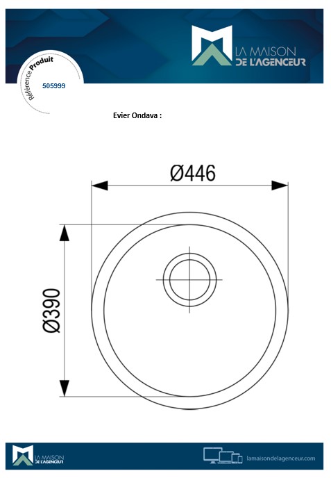 Évier Ondava, acier inoxydable poli, diam. 446. Évier avec trop-plein. Un siphon extra-plat est inclus dans le package. L'évier est fourni sans ouverture. • Dimensions : dia. 446 mm • Découpe : dia. 418 mm • Baignoire : dia. 390 mm • Profondeur d'évier : 185 mm • Epaisseur de tôle : 0,7 mm
